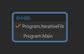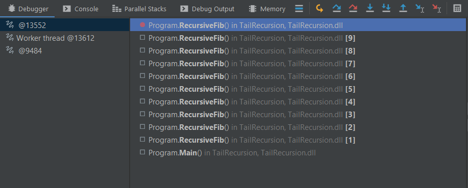 If we set a breakpoint at return n and call the function with RecursiveFib(10), we will get the following stack frame. There are 10 entries in the stack frame.