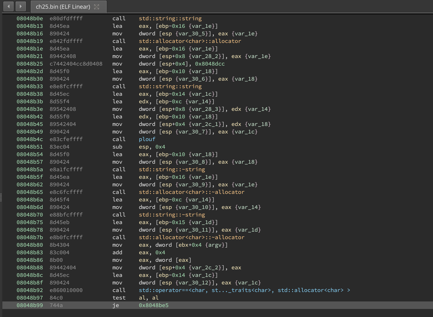 , we can see that plouf is an interesting function and it’s definitely doing something, like decoding something from the binary and constructing a string.
